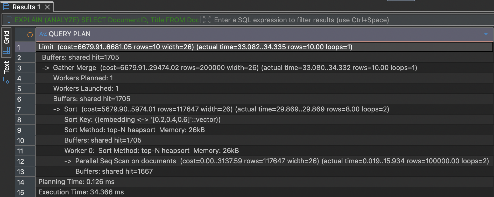 Without a vector index, PostgreSQL must scan the entire table and compute distances for every row.